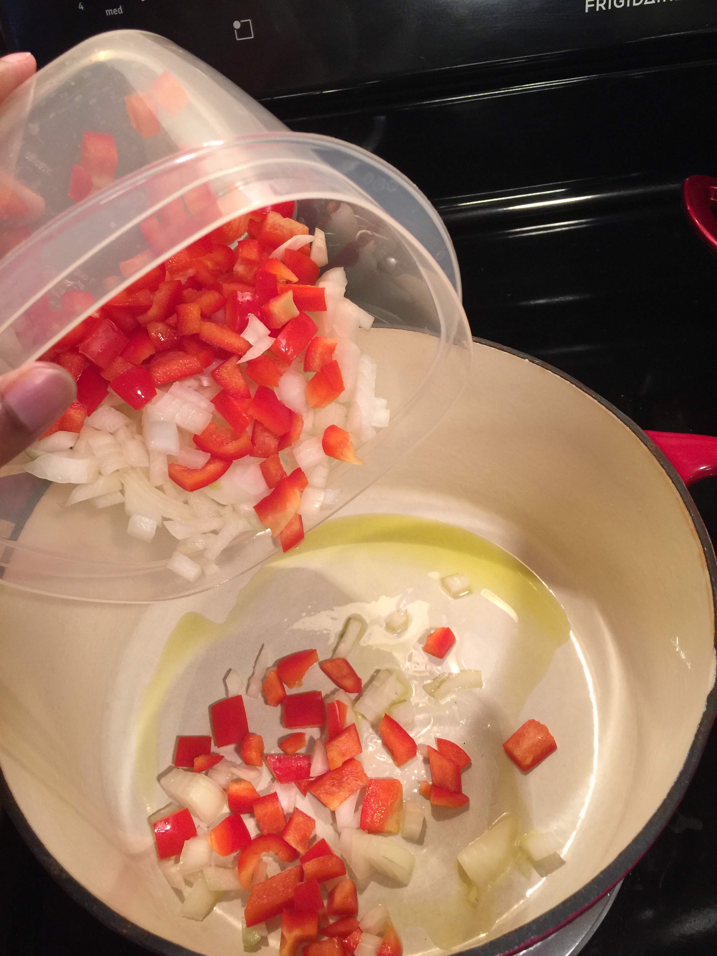 In a large heavy duty Dutch oven, heat olive oil over medium heat. Add onion and red bell pepper, sauté the vegetables for 8 minutes or until soft and lightly Browned, stirring occasionally.