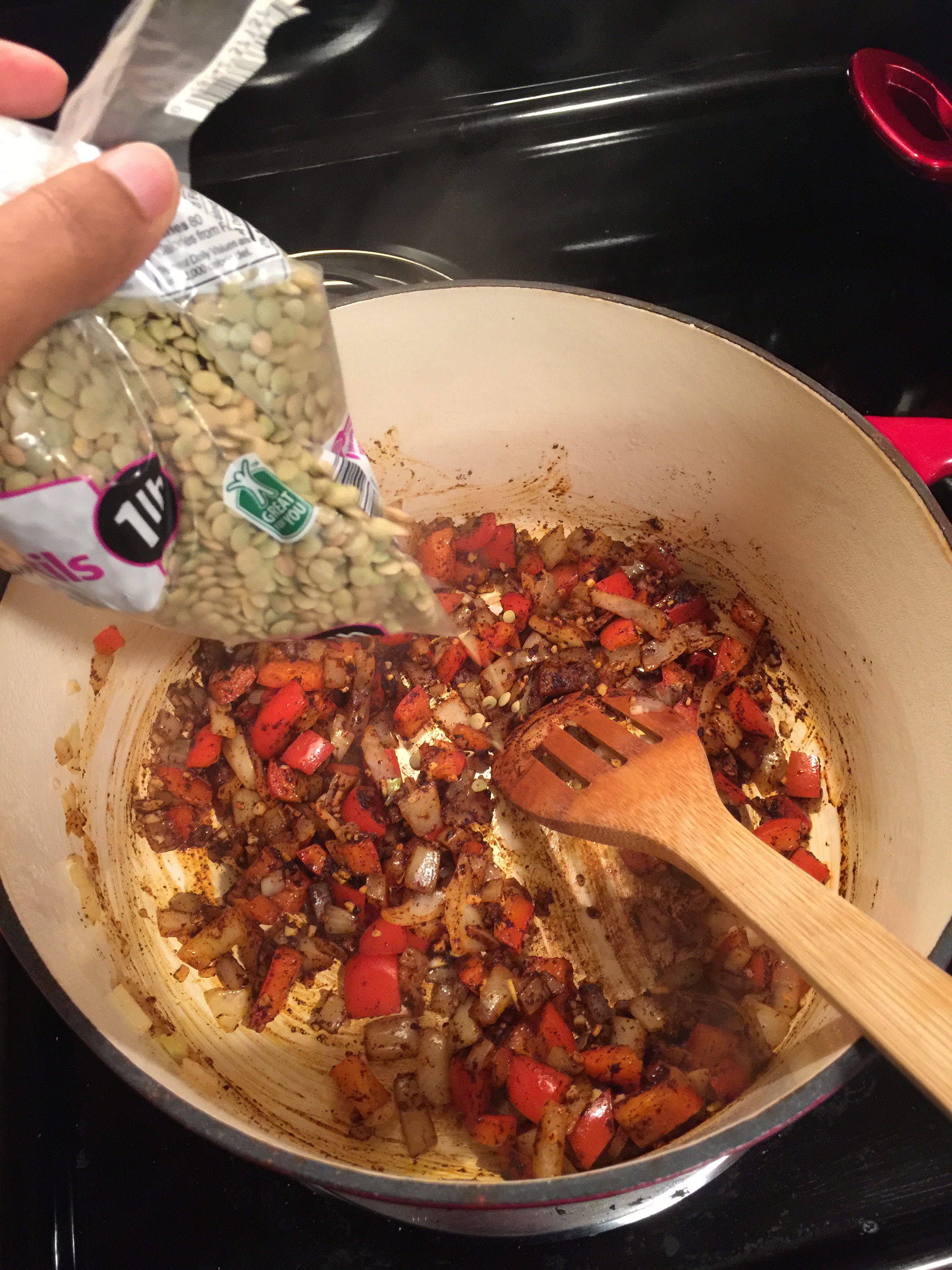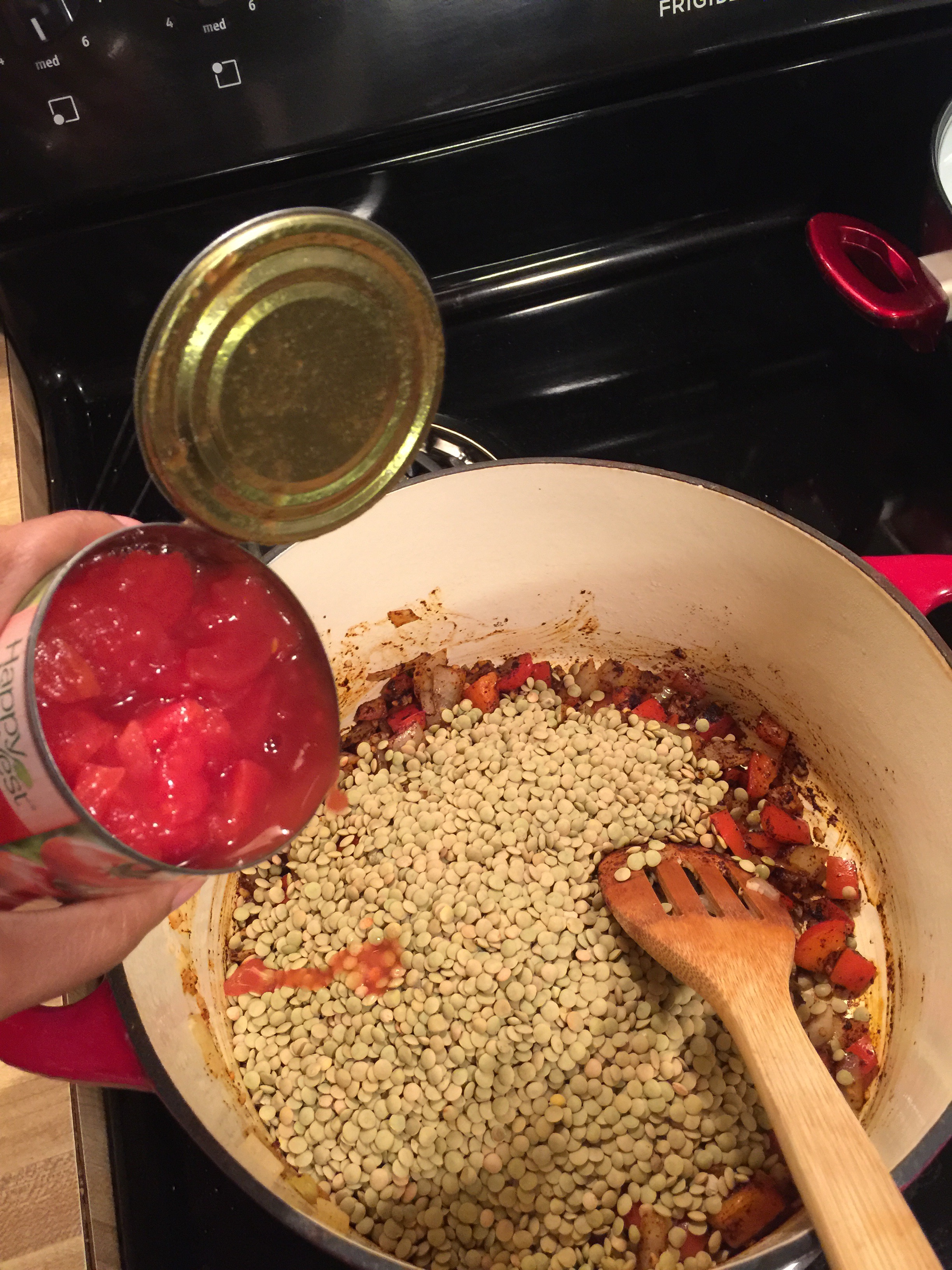 Add lentils, tomatoes, Bay leaf and stock. Season with salt and ground black pepper, to taste. Bring to a boil, lower the heat to medium low and simmer, partially covered for 30 minutes or until lentils are tender.