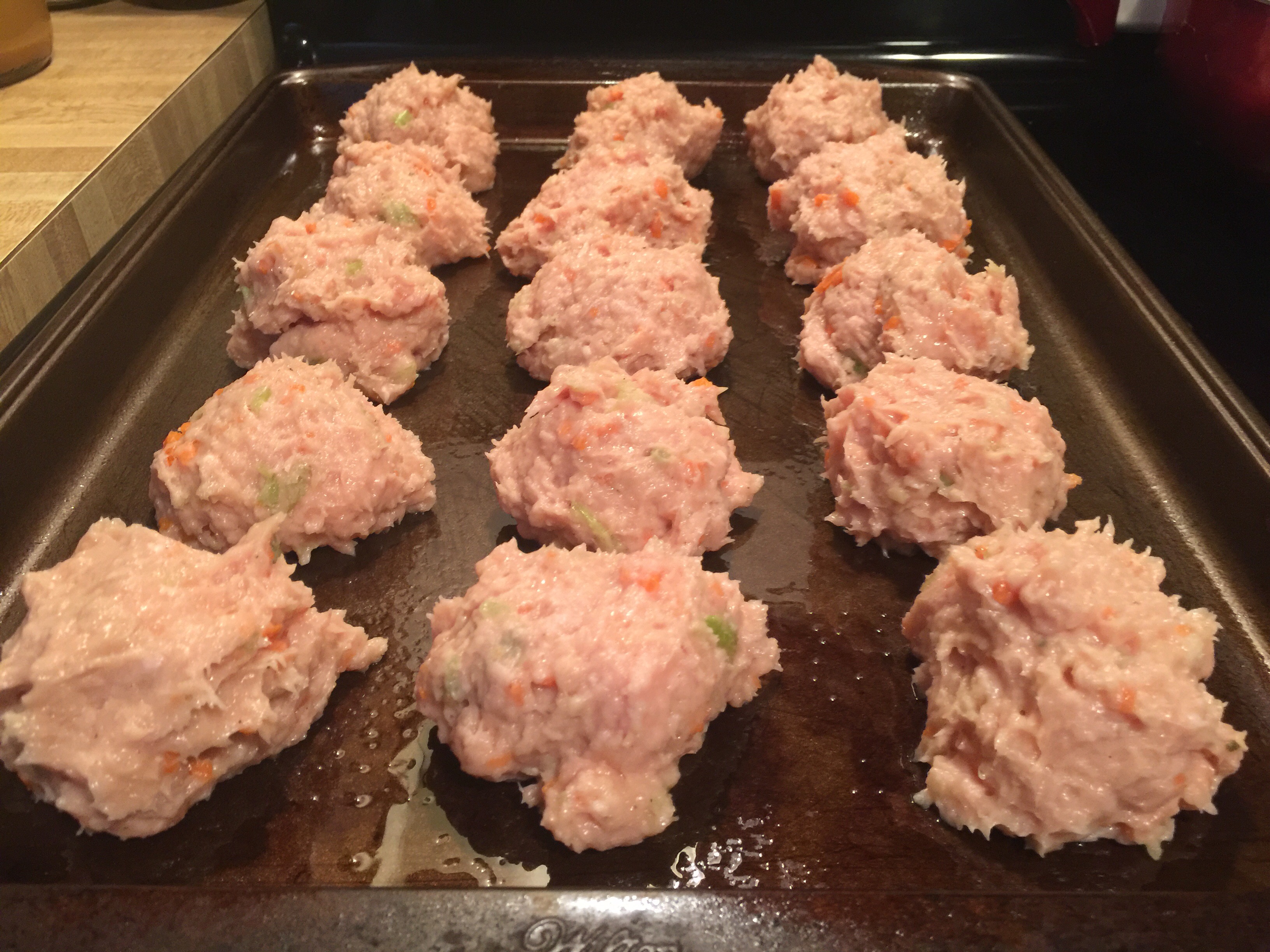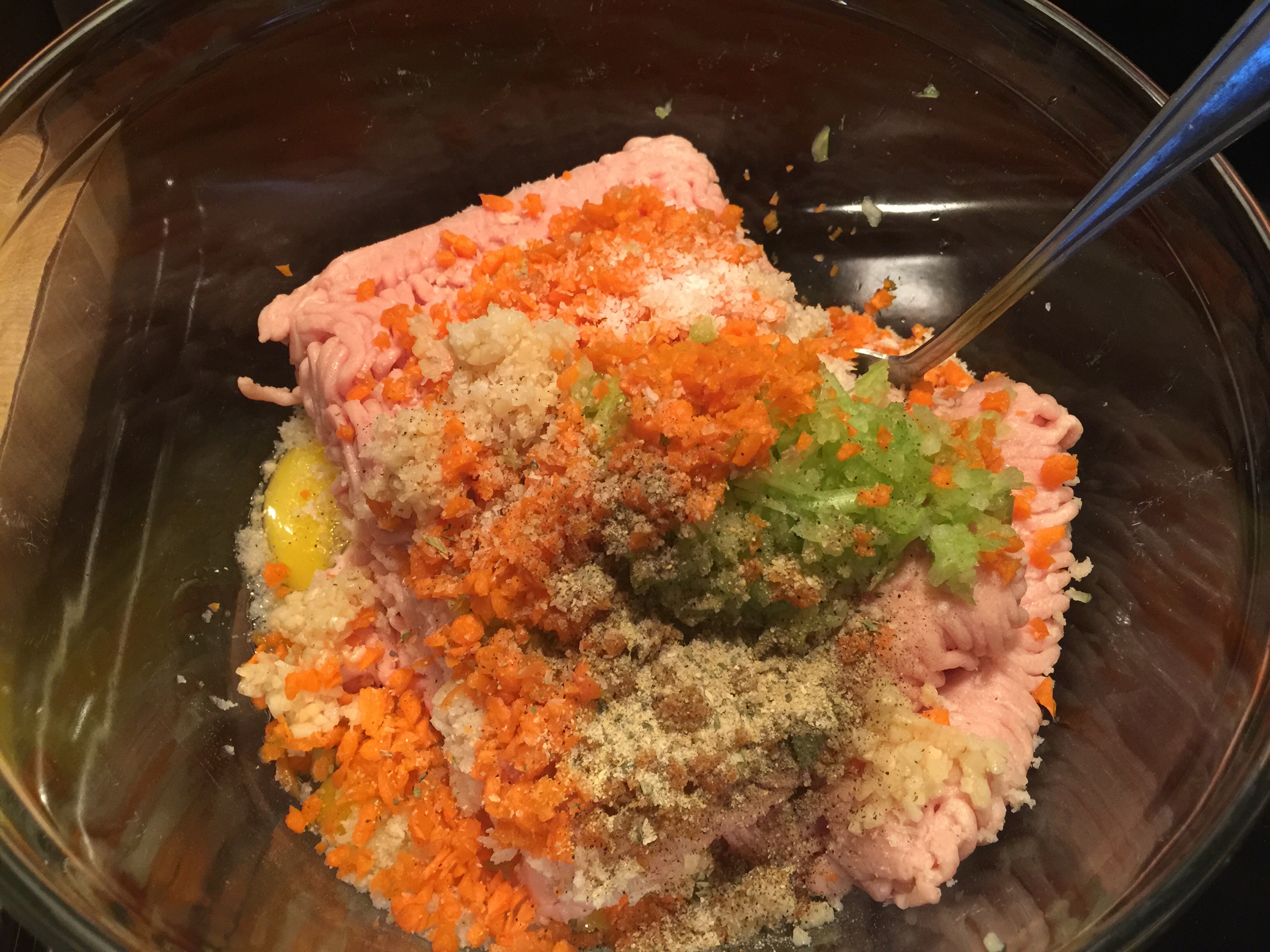 In a large bowl, combine the ground chicken, panko crumbs, egg, scallions, celery, carrot and garlic; season with salt and pepper, to taste.
