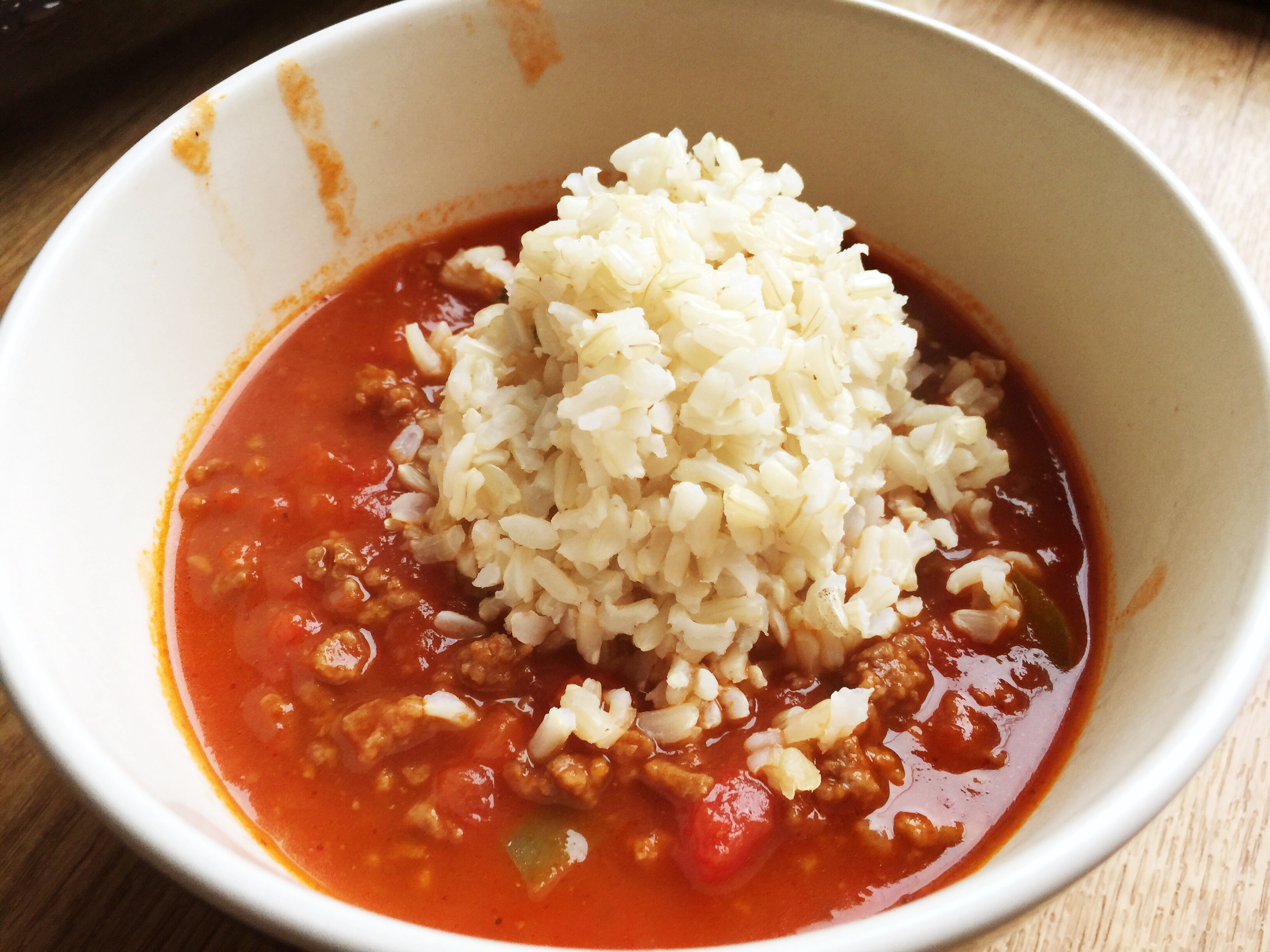 Add tomatoes, tomato sauce, chicken broth, oregano and season with salt and pepper to taste. Cover and simmer on low heat for 30 minutes. Serve about 1 1/2 cups of soup in each bowl and top with 1/2 cup cooked brown rice.