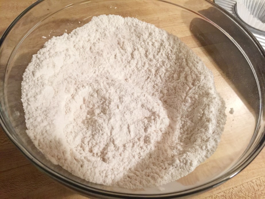 Fold in flour mixture, and mix until dry ingredients are just combined. Do not over mix. Scoop about ¼ cup of batter each muffin tin.