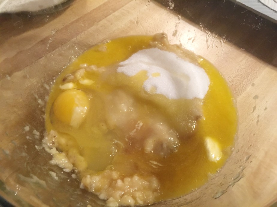 Combine bananas, sugar, egg, vanilla and melted butter in a large bowl.