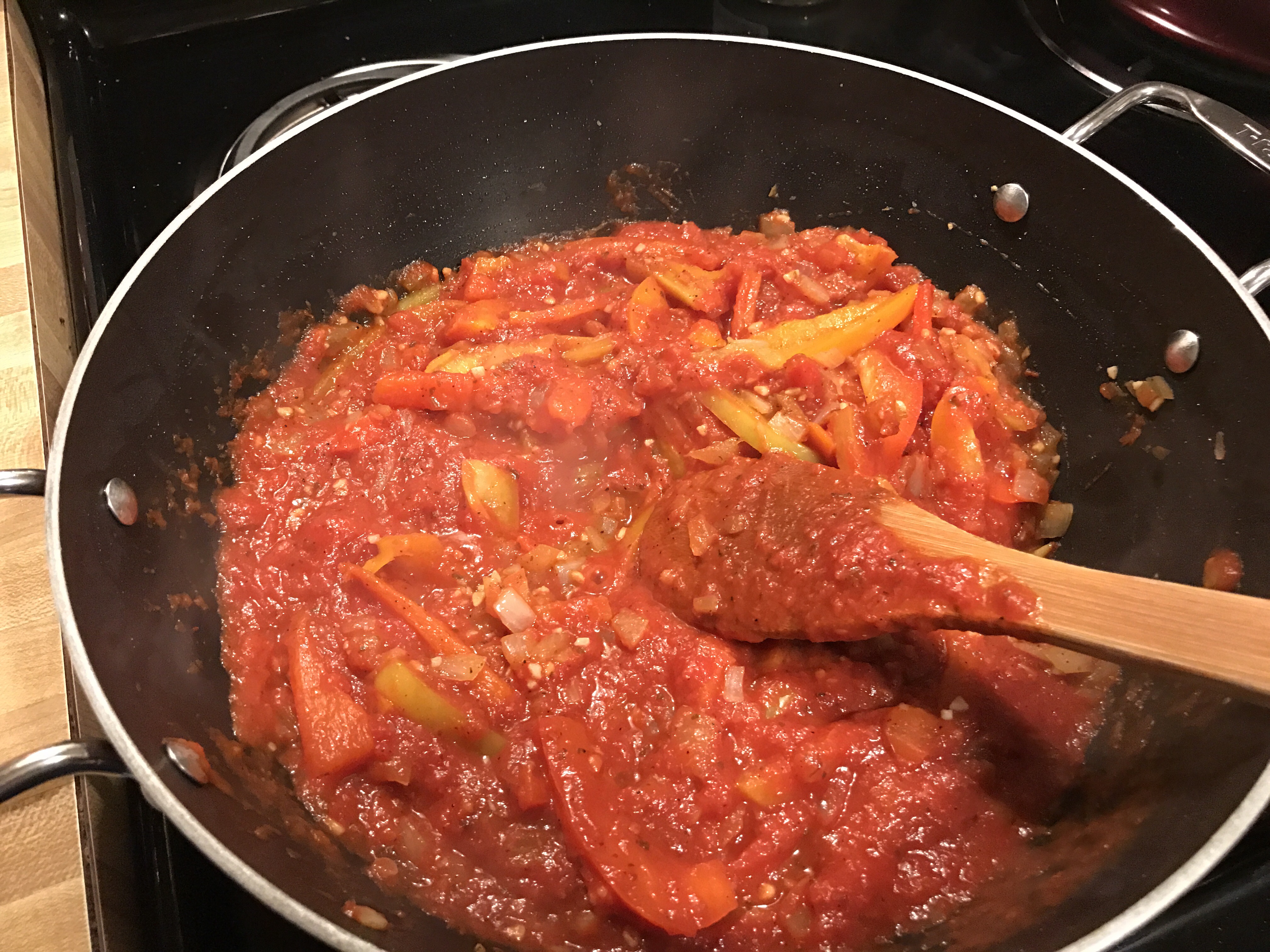 Stir the Pasta sauce into the pan with the peppers and onions. Slice the sausage into 1/2 inch pieces and add to the pan as well.