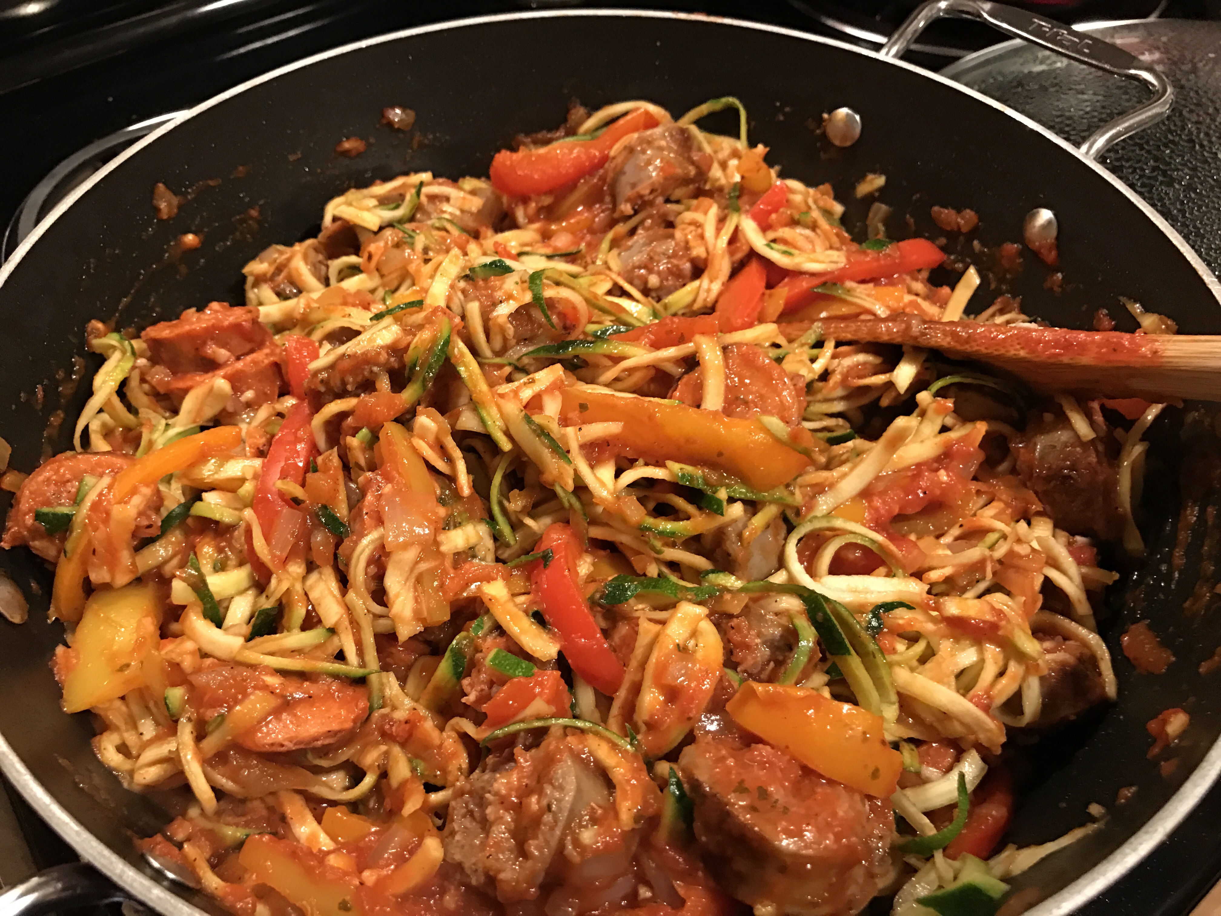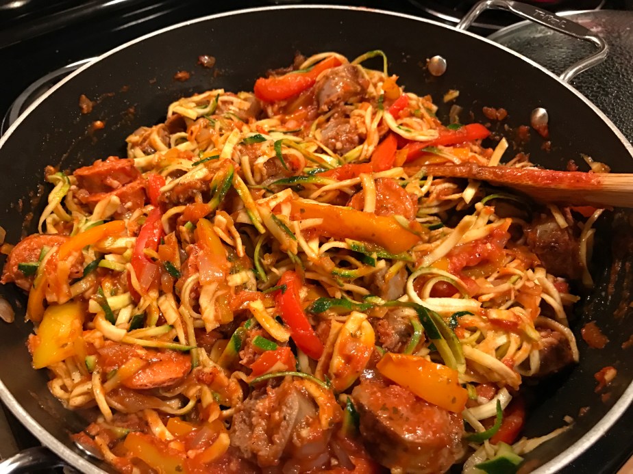 While the vegetables are cooking, zoodle your zucchini. Then cut the strands into ~8 inch pieces (this does not have to be precise, but cutting the zoodles now will make it easier to serve).