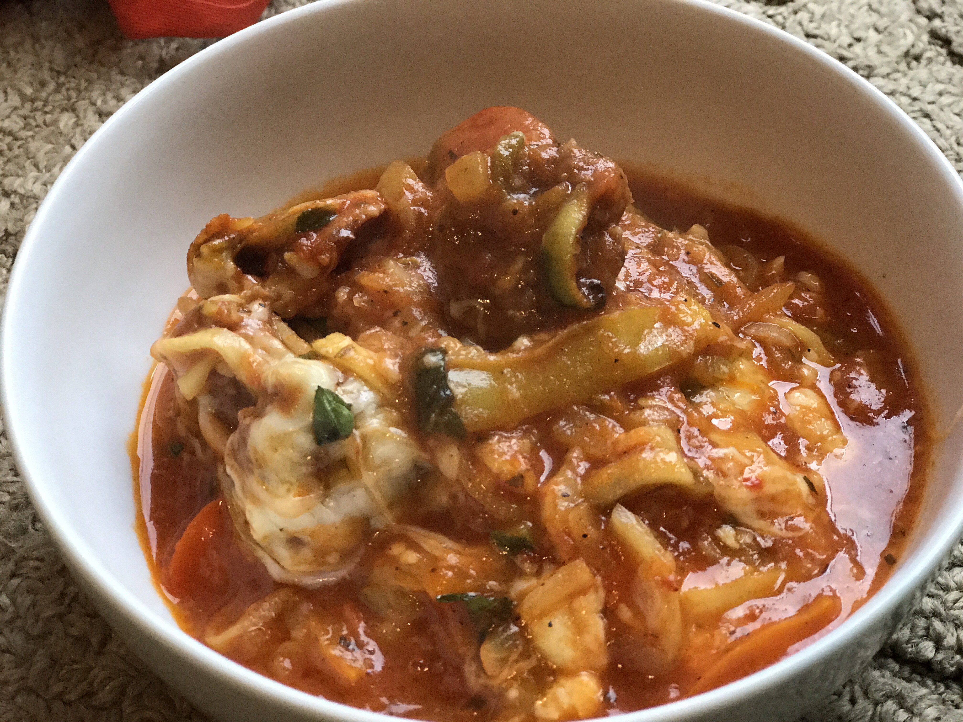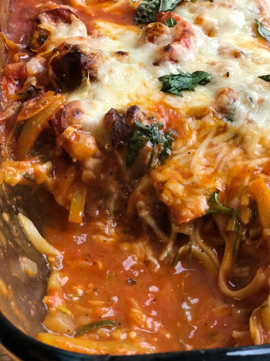 Fold zucchini noodles and basil into the mixture and allow to cook for 4 minutes on medium-low. Transfer to a 9×13 baking dish, and top with cheese.
