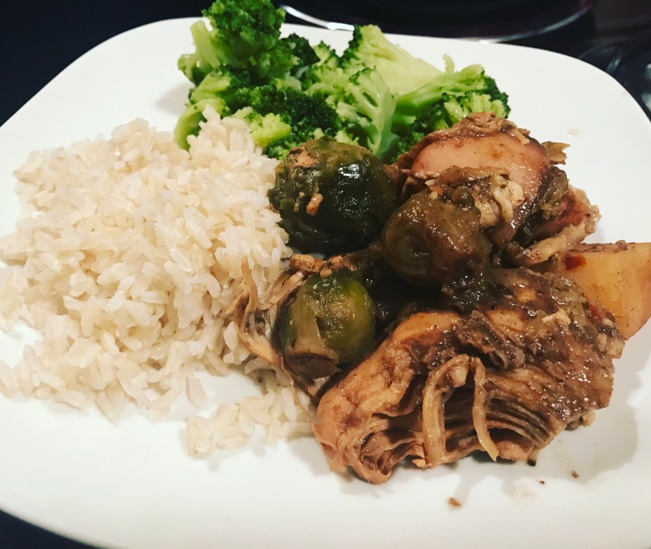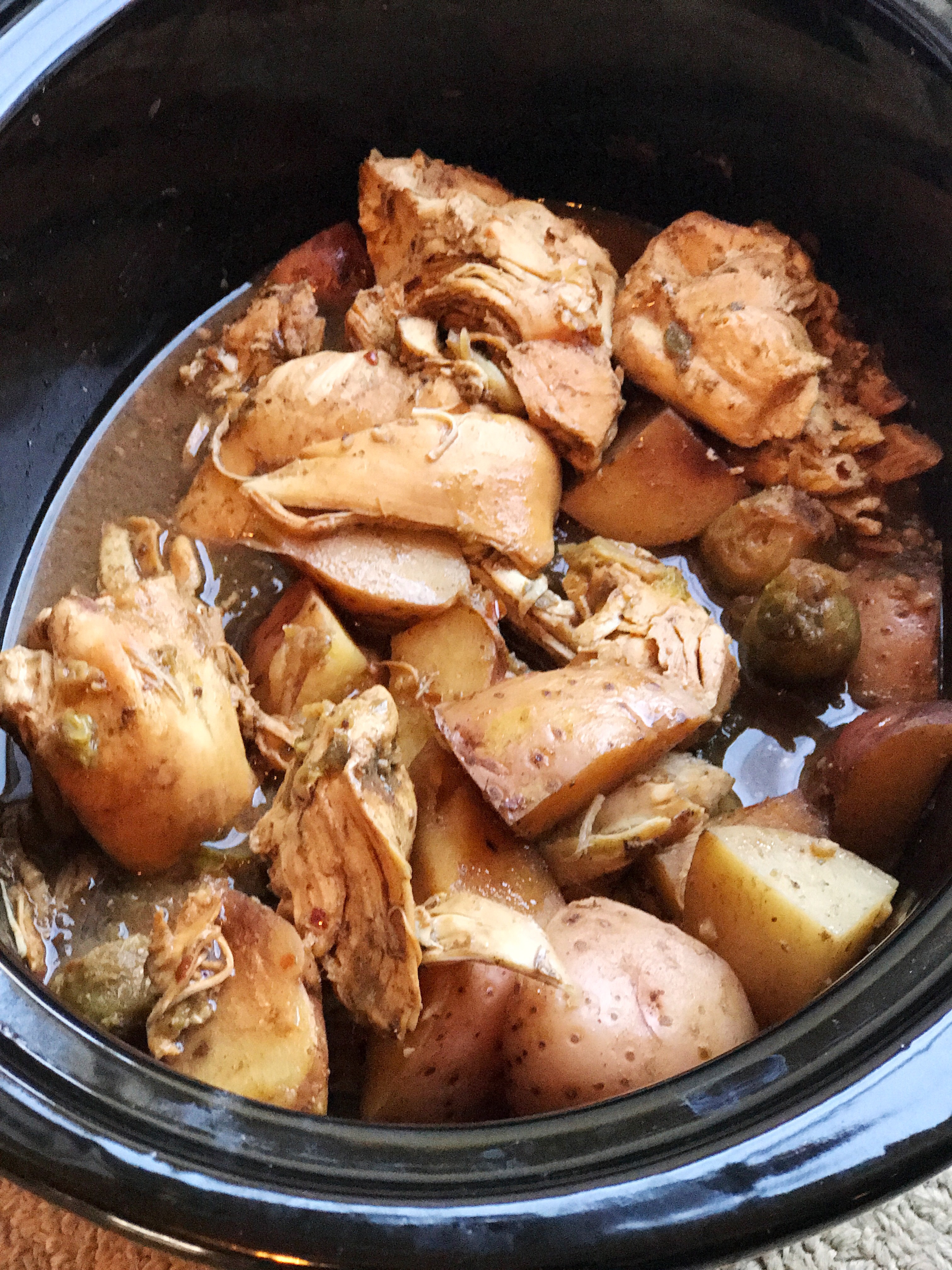 In a large slow cooker, add Brussels sprouts and potatoes in an even layer and place chicken on top.