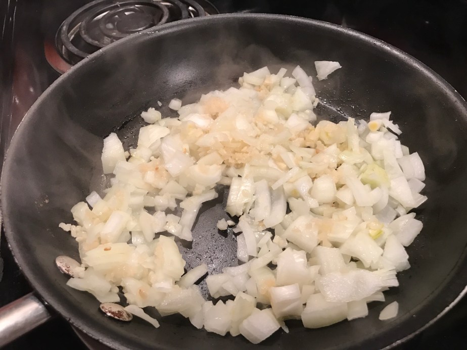 Heat oil over medium/high heat in a medium skillet. Add onion and garlic and cook until translucent, about 3 minutes. I like mine to be a bit under-sauteed, to keep a bit of their crunch.