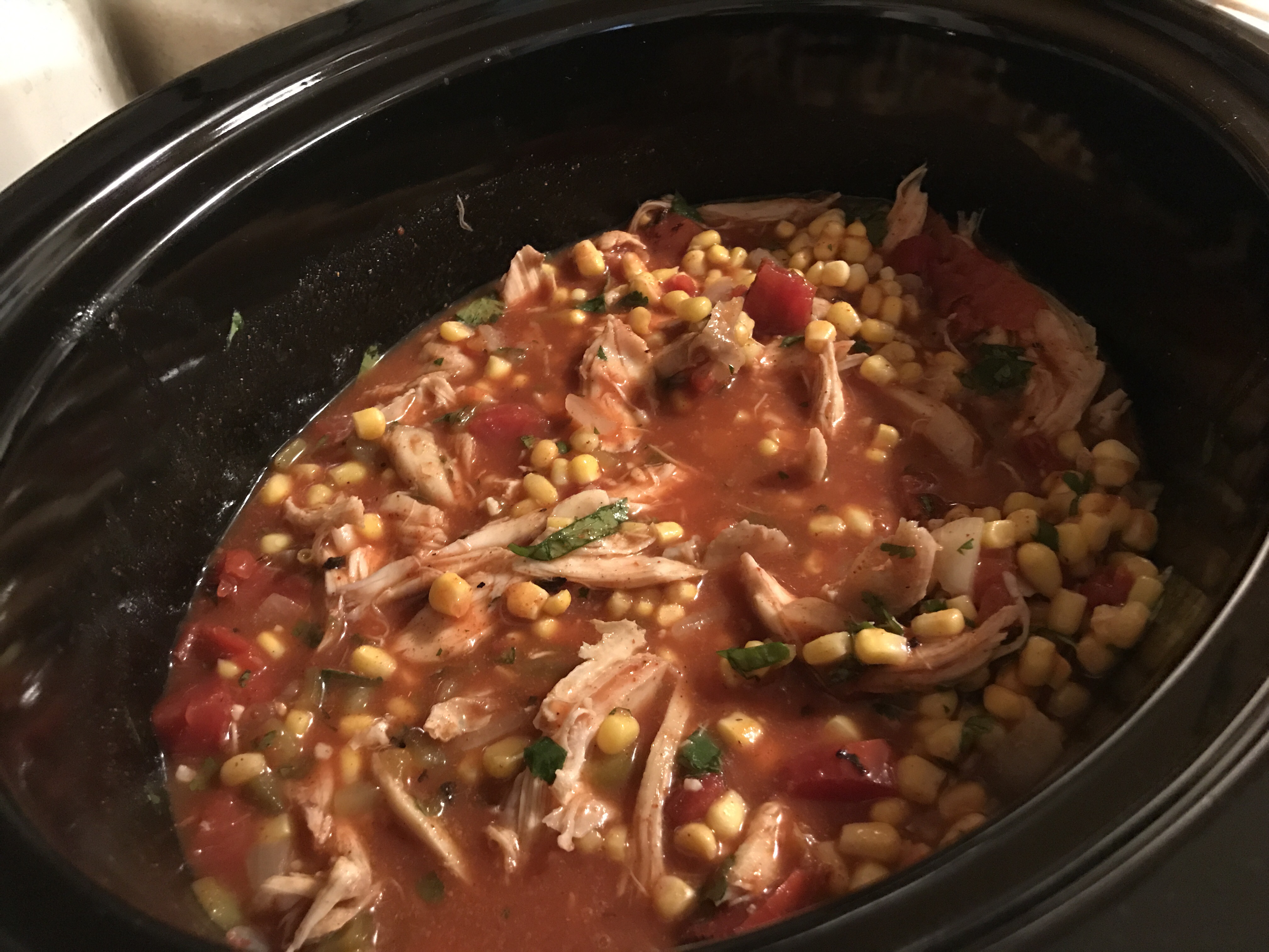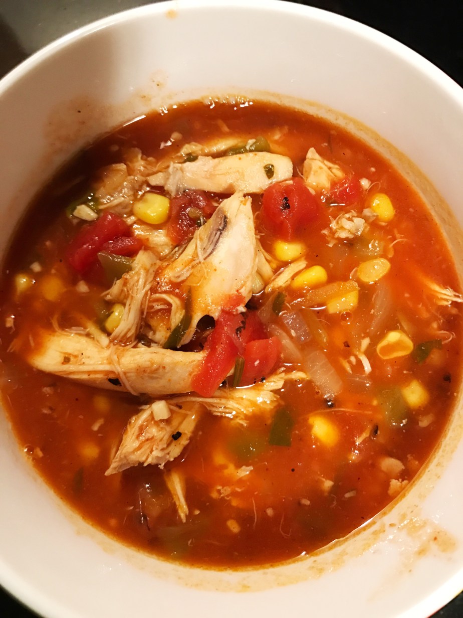 I used store bought rotisserie chicken for this recipe. It only takes 2-3 hours to cook on high. Optional toppings are cilantro, jalapeños, low fat sour cream and low fat cheese!