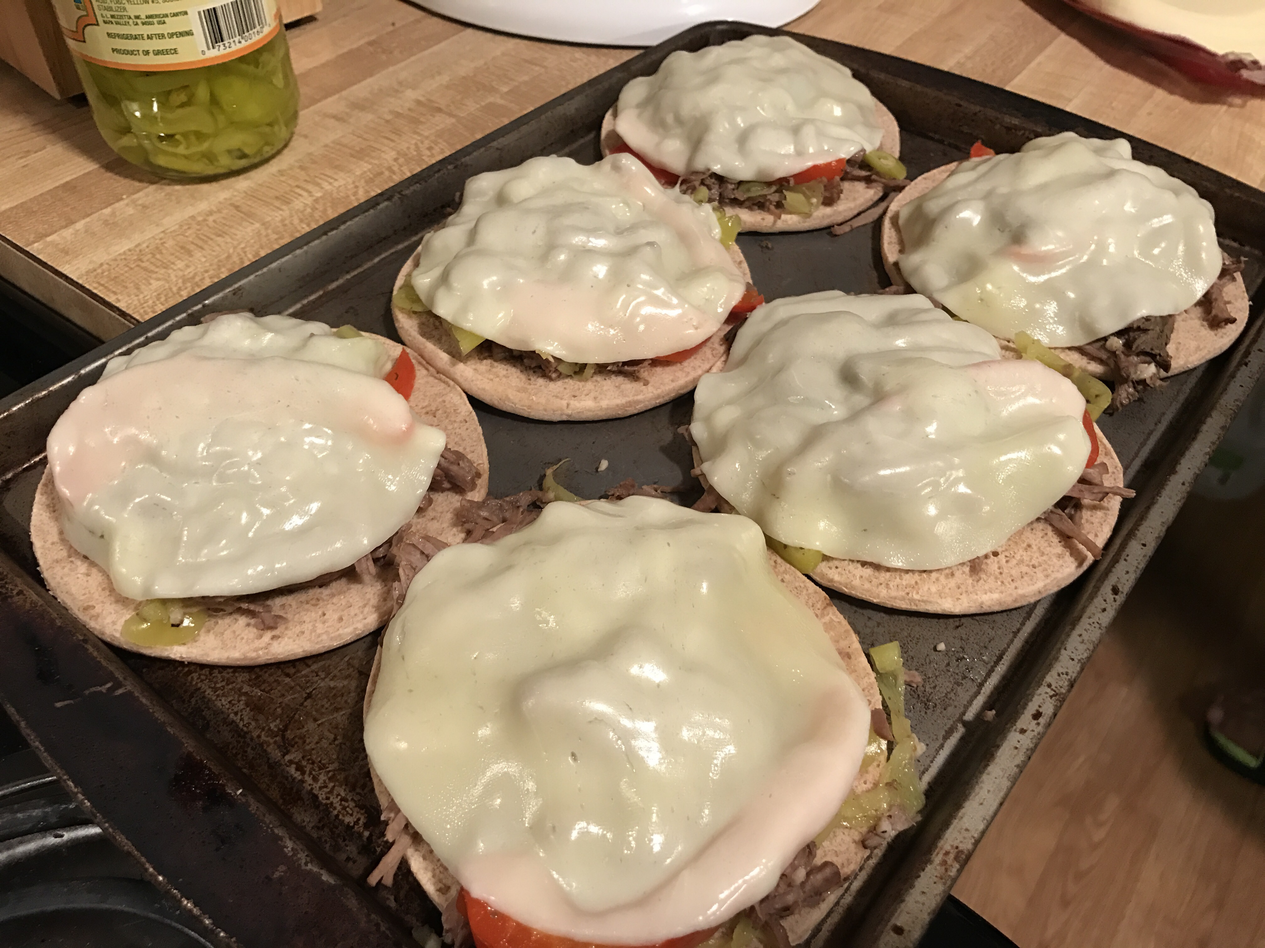To serve, top each roll or bread with 3 oz meat mixture, top with 1 slice cheese, and some of the remaining pepperoncinis. Serve the remaining liquid as a dip for the sandwich, if desired. If desired, place the bread under the broiler 2-3 minutes to melt the cheese.