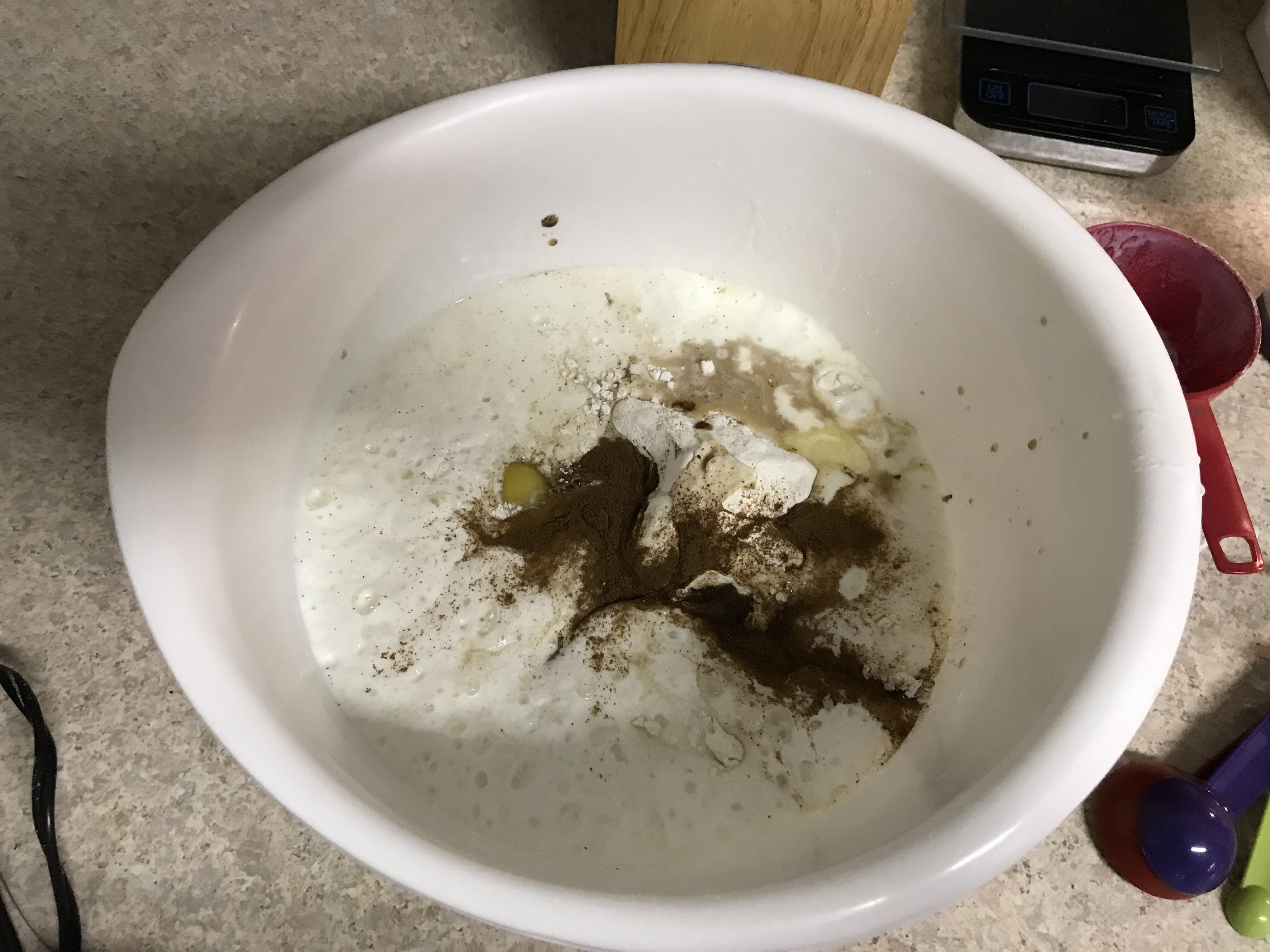 In a separate bowl, combine buttermilk, vanilla, ground cinnamon and egg. Whisk to combine. Add melted butter and whisk again.