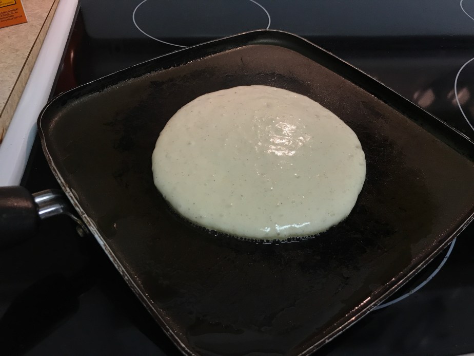 Use a 1/4 or 1/3 cup measuring cup to scoop the pancake batter onto the griddle or skillet. Slowly pour it onto the surface, circling outwards to make a nice circle.
