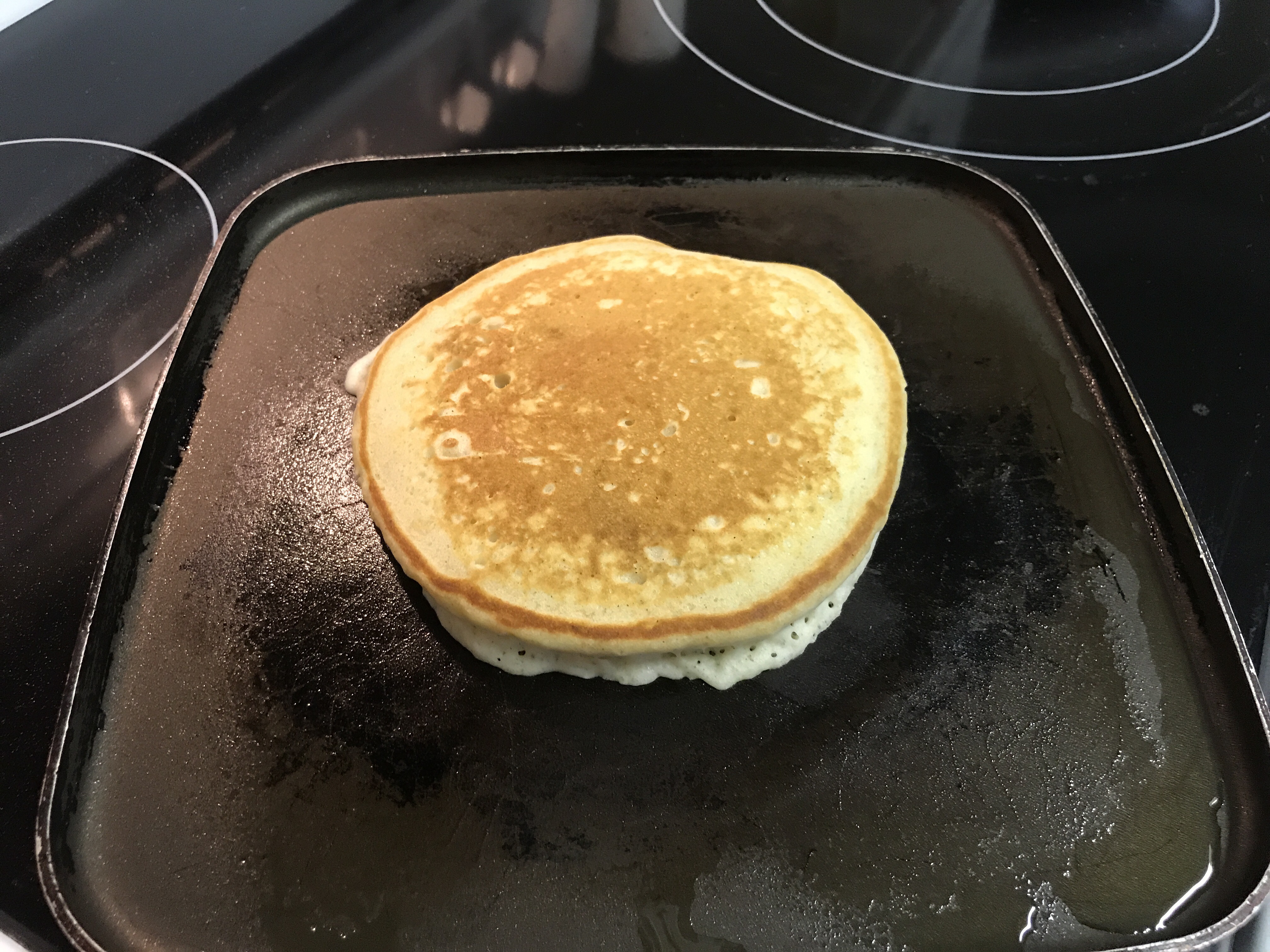 Let the pancake cook about 2-3 minutes. You’ll notice bubbles popping up on the surface of the pancake, if the edges look set, carefully flip the pancake over. Cook another 2 minutes on the other side.