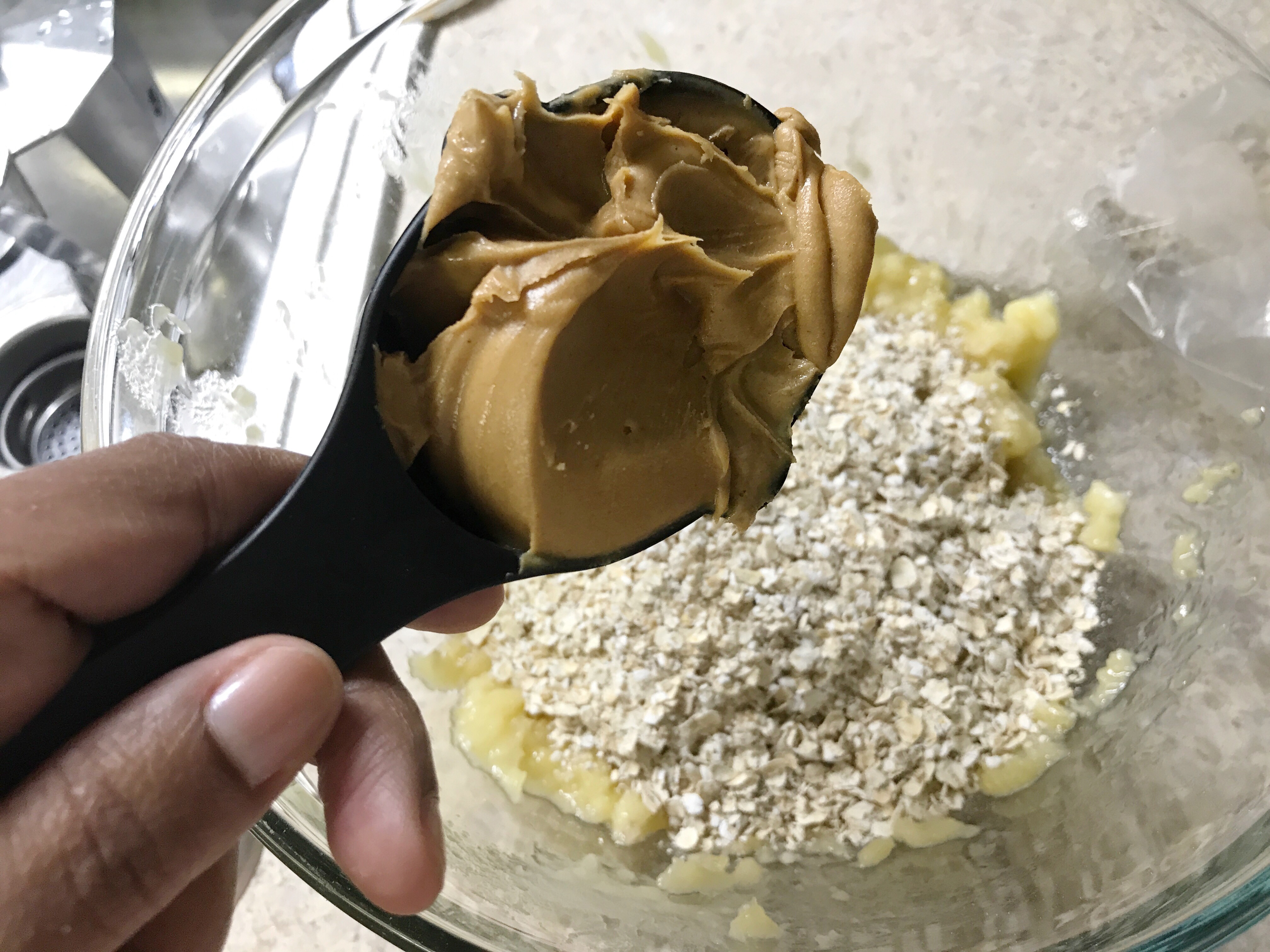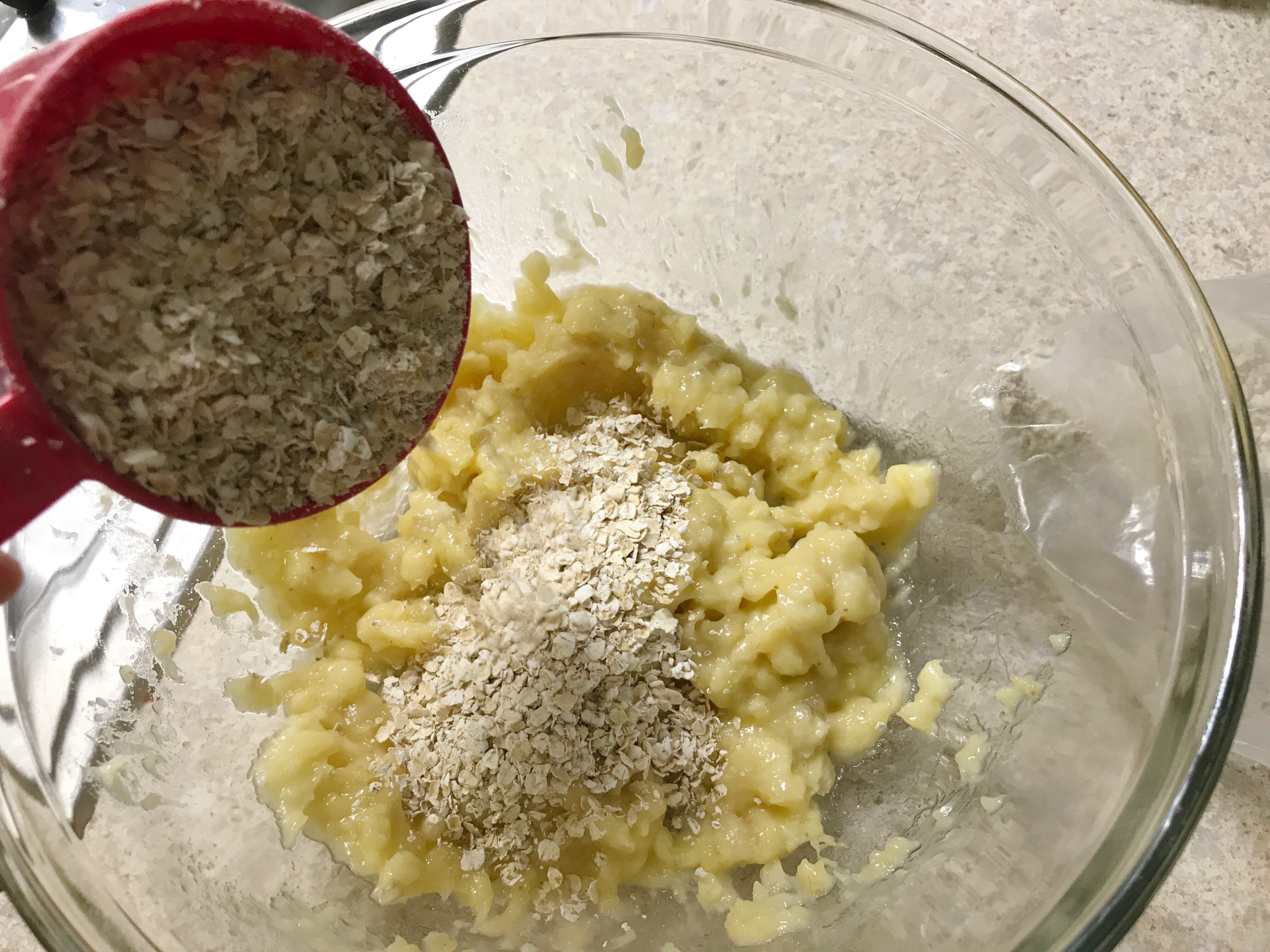Add oats, peanut butter, maple syrup and egg and mix well.